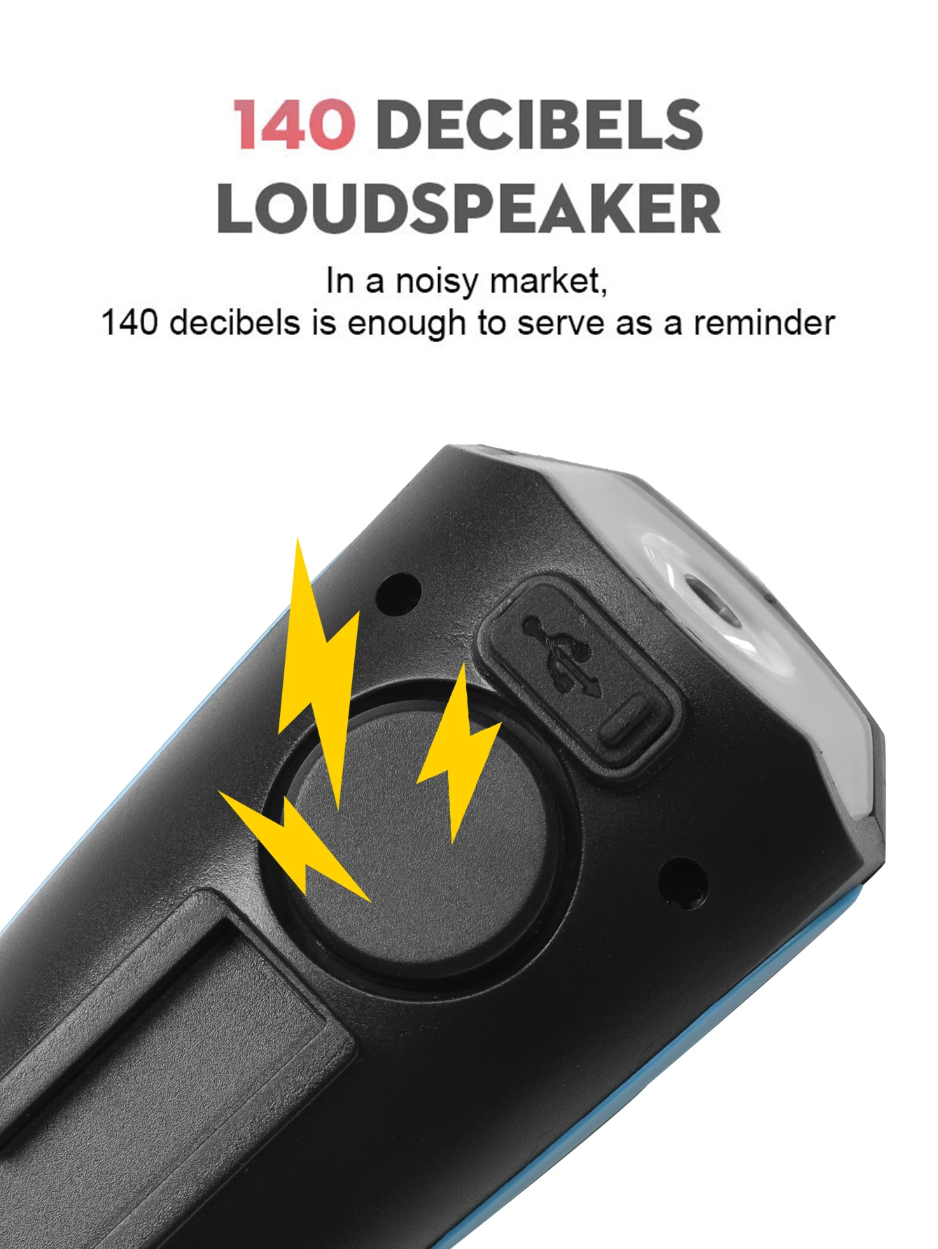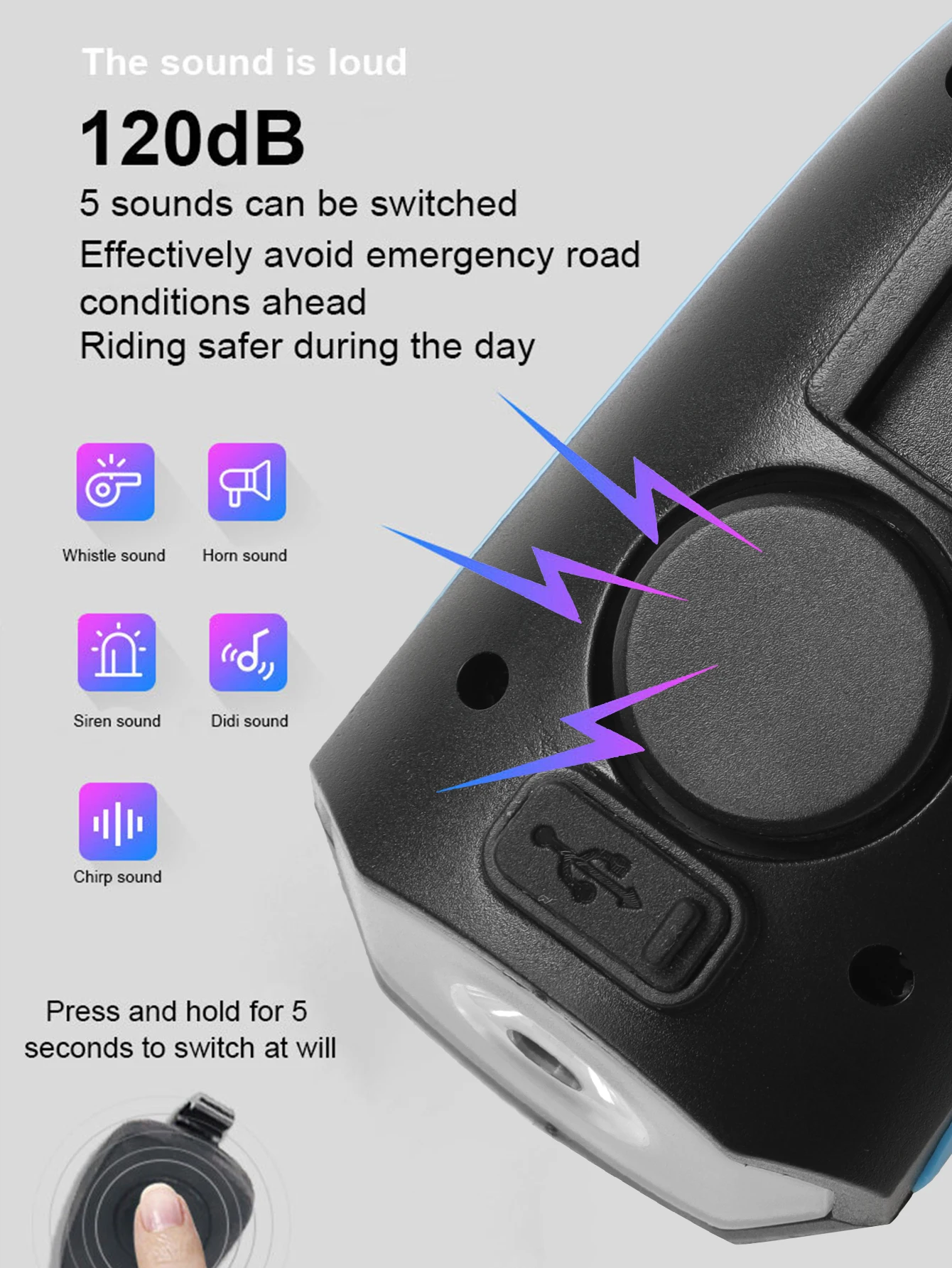 Select from 5 different sounds Loud speaker which is loud enough to alert anyone to your presence.